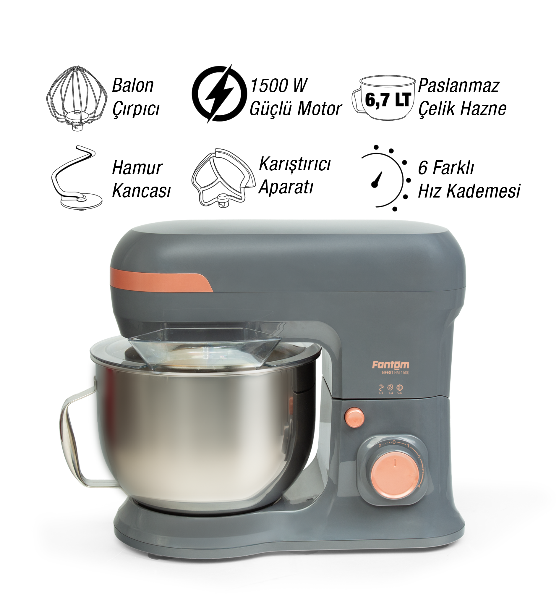 NFEST HM 1500 Hamur Yoğurma Makinesi 1500 W güçlü motoru ve metal dişli sistemi sayesinde hamur yoğurmadan çırpmaya, çiğköfte yoğurmadan kek karışımlarına kadar tüm tariflerde üstün performans sağlar. 304 paslanmaz çelikten üretilmiş 6.7 litre yapışmaz haznesi, tek seferde yüksek miktarda hazırlık yapmanıza imkan tanır. Alüminyum + teflon kaplamalı karıştırıcı ve kanca aparatı ile paslanmaz çelik çırpıcı aparatı; farklı tarifler için çok yönlü kullanım sağlar. 6 hız ayarı ve Pulse özelliği kontrolü size bırakır. Şeffaf sıçrama önleyici kapak, tek tuşla açılabilen üst gövde ve kaymayı önleyen 6 vantuz ayak ise konforlu ve güvenli kullanım sunar. Tüm tarifleri en kalabalık sofralar için bile hızlı ve zahmetsizce hazırlar.