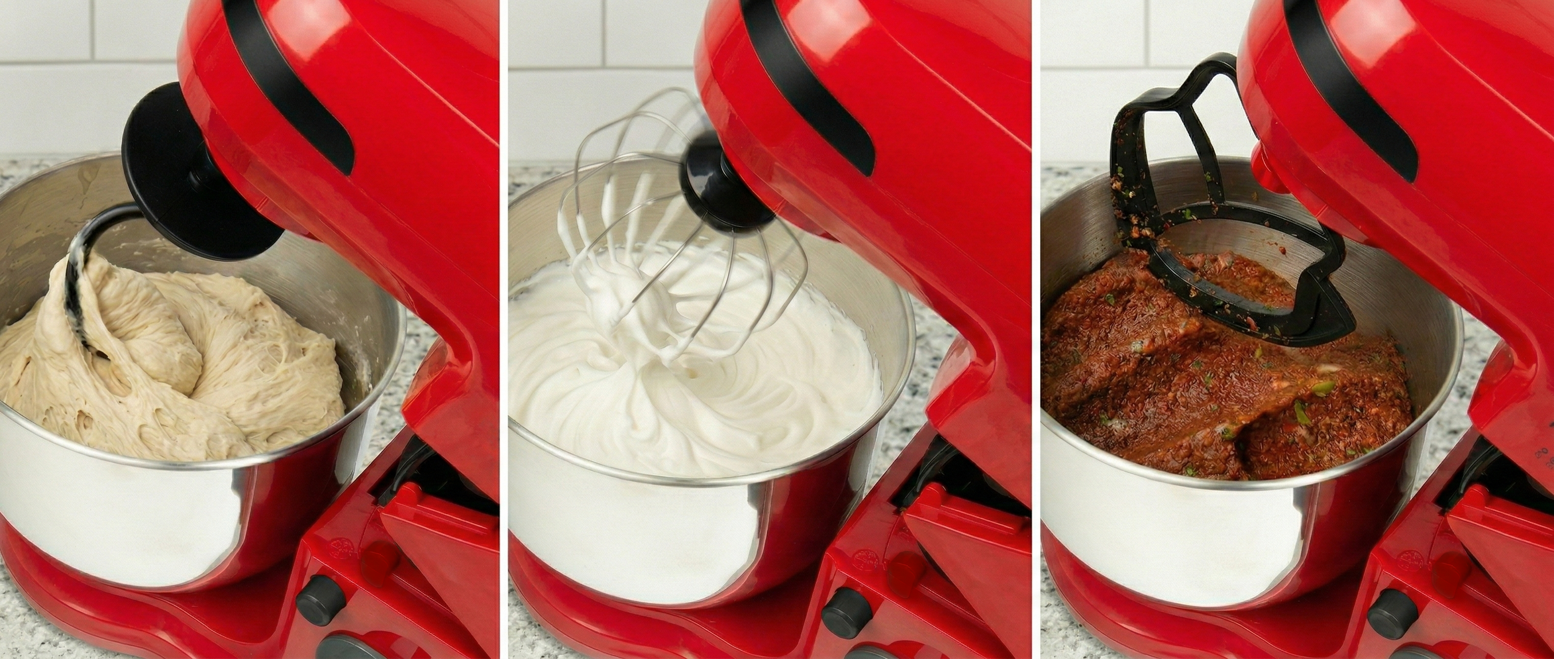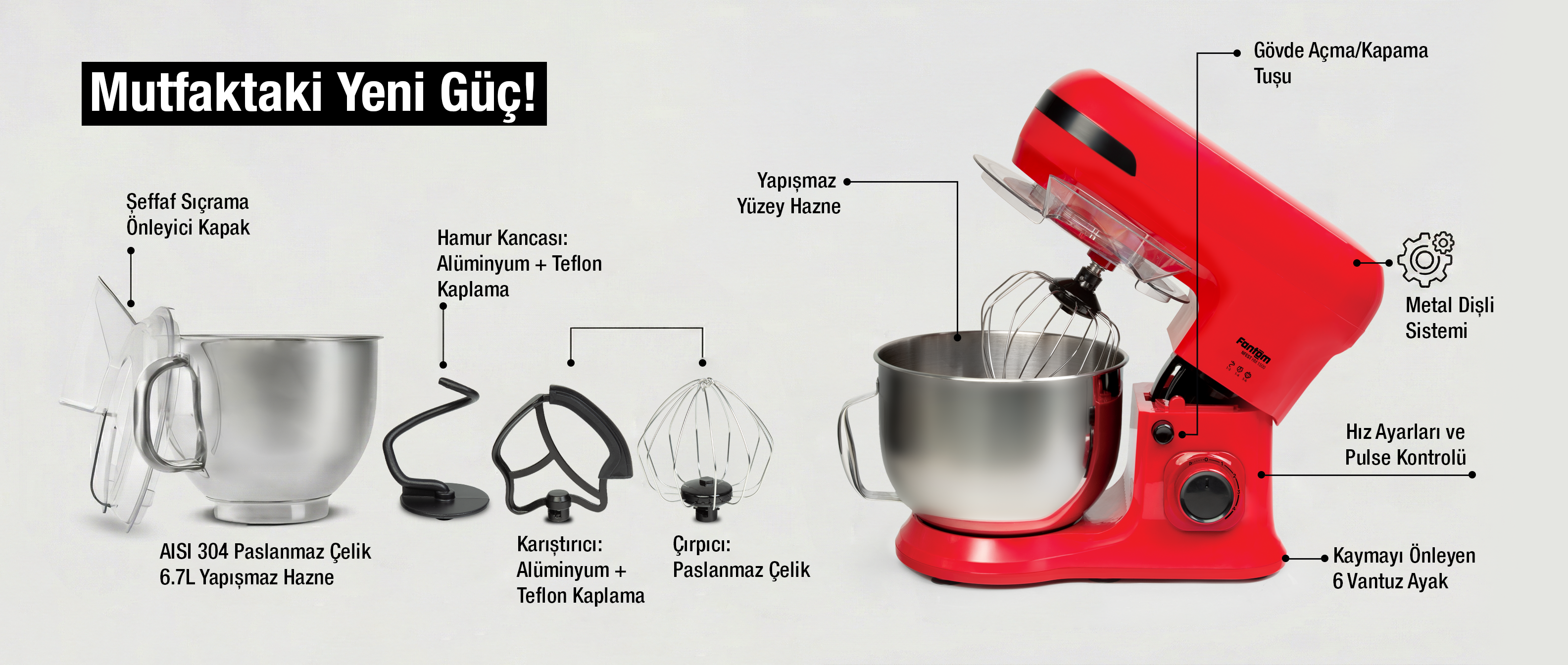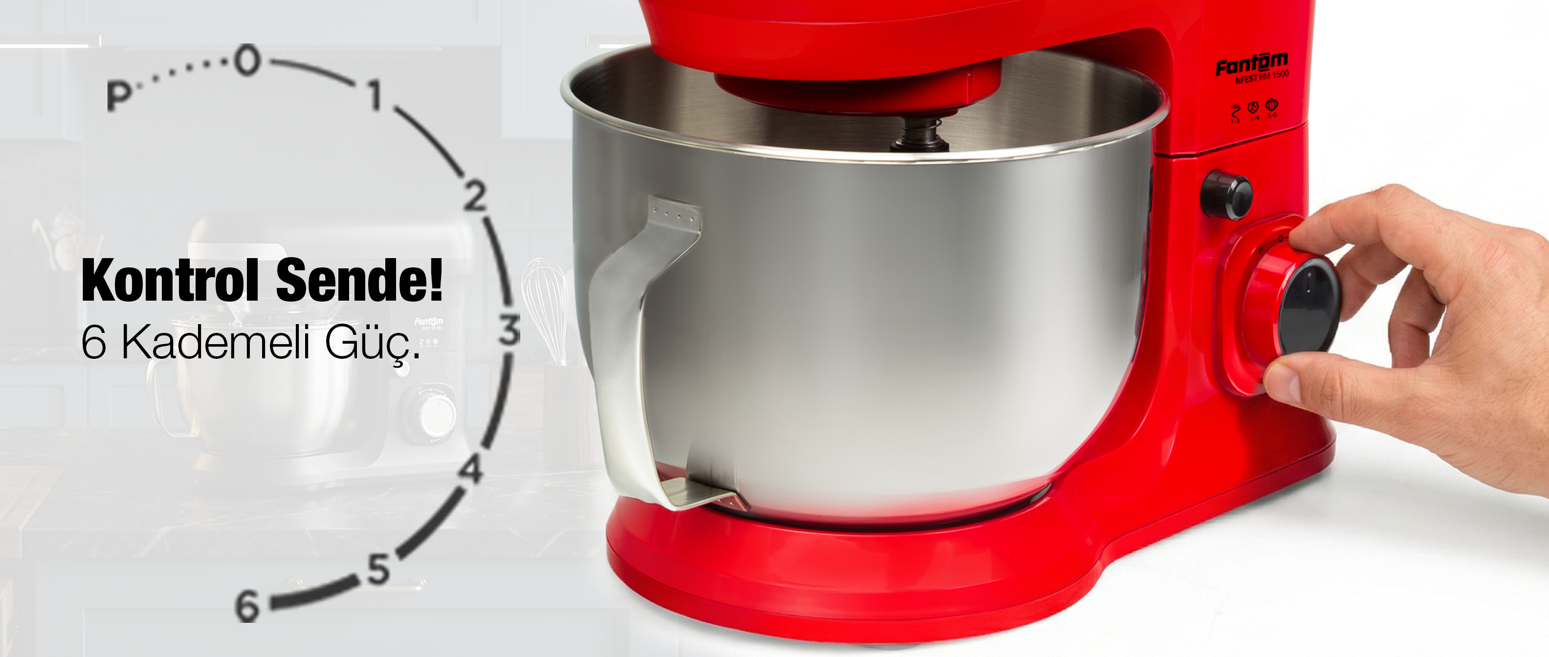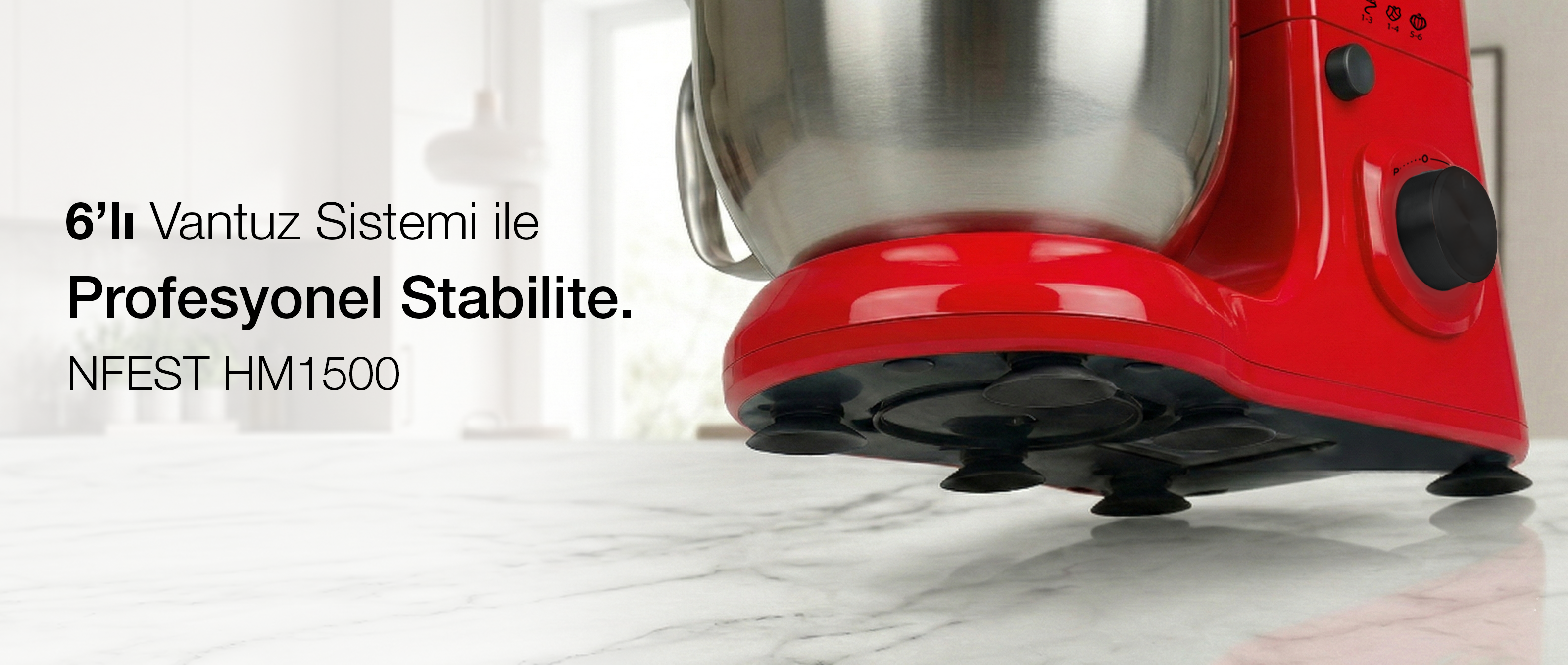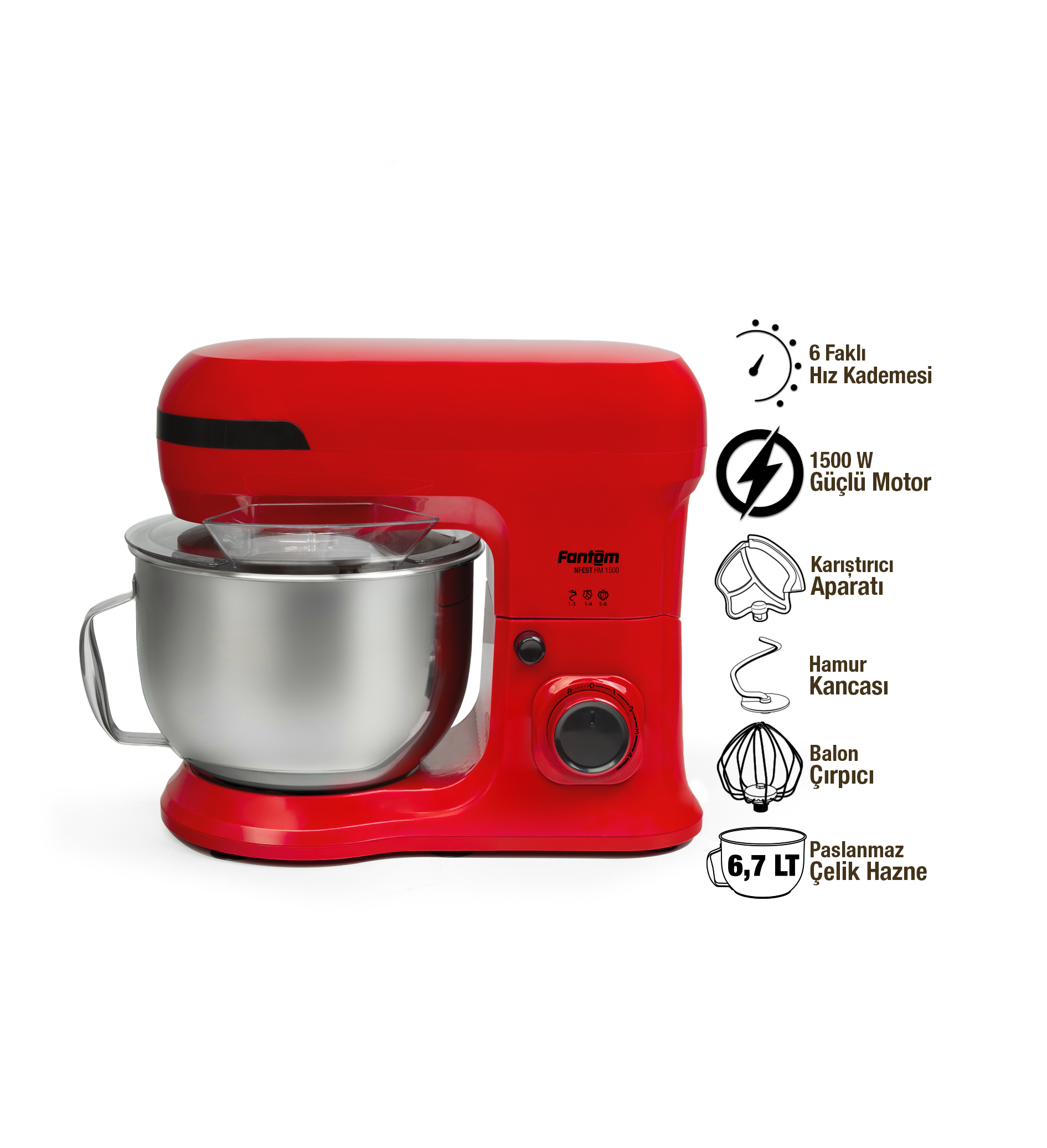 NFEST HM 1500 Hamur Yoğurma Makinesi 1500 W güçlü motoru ve metal dişli sistemi sayesinde hamur yoğurmadan çırpmaya, çiğköfte yoğurmadan kek karışımlarına kadar tüm tariflerde üstün performans sağlar. 304 paslanmaz çelikten üretilmiş 6.7 litre yapışmaz haznesi, tek seferde yüksek miktarda hazırlık yapmanıza imkan tanır. Alüminyum + teflon kaplamalı karıştırıcı ve kanca aparatı ile paslanmaz çelik çırpıcı aparatı; farklı tarifler için çok yönlü kullanım sağlar. 6 hız ayarı ve Pulse özelliği kontrolü size bırakır. Şeffaf sıçrama önleyici kapak, tek tuşla açılabilen üst gövde ve kaymayı önleyen 6 vantuz ayak ise konforlu ve güvenli kullanım sunar. Tüm tarifleri en kalabalık sofralar için bile hızlı ve zahmetsizce hazırlar.