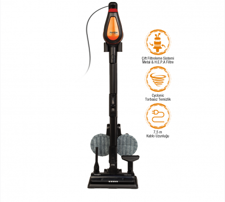 Dar alan aparatları ile her köşeye ulaşır; metal ve HEPA çift filtre sistemiyle temiz hava çıkışı sağlar. 1,3 L toz haznesi, tek tuşla boşaltım özelliği ve 7,5 m kablosu ile pratik kullanım sunar. Katlanabilir metal borusu ve ayaklı stand park özelliği sayesinde ergonomik ve düzenli saklama imkânı sağlar.
