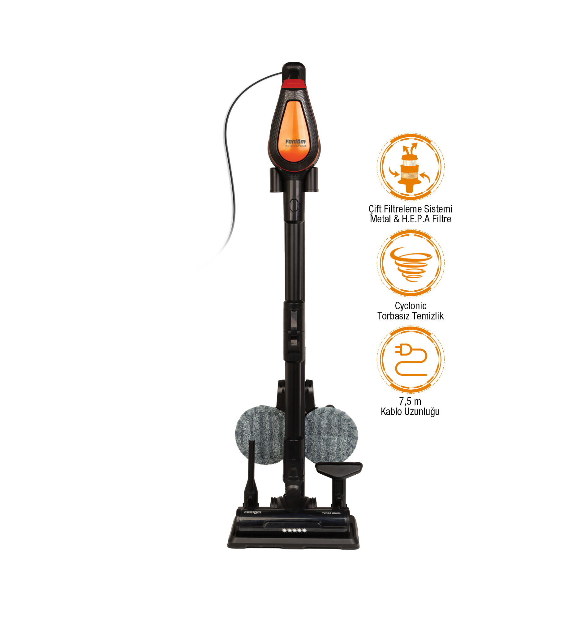 500 W Cyclone teknolojili dikey elektrikli süpürge, güçlü emiş performansı ile etkili temizlik sunar. LED’li motorlu turbo başlığı ve saç dolanmasını önleyen özel fırça tasarımı sayesinde halılarda derinlemesine temizlik sağlar. Ovalayarak silen mop başlığı ve yıkanabilir pedleri ile hijyenik zemin temizliği sunar.